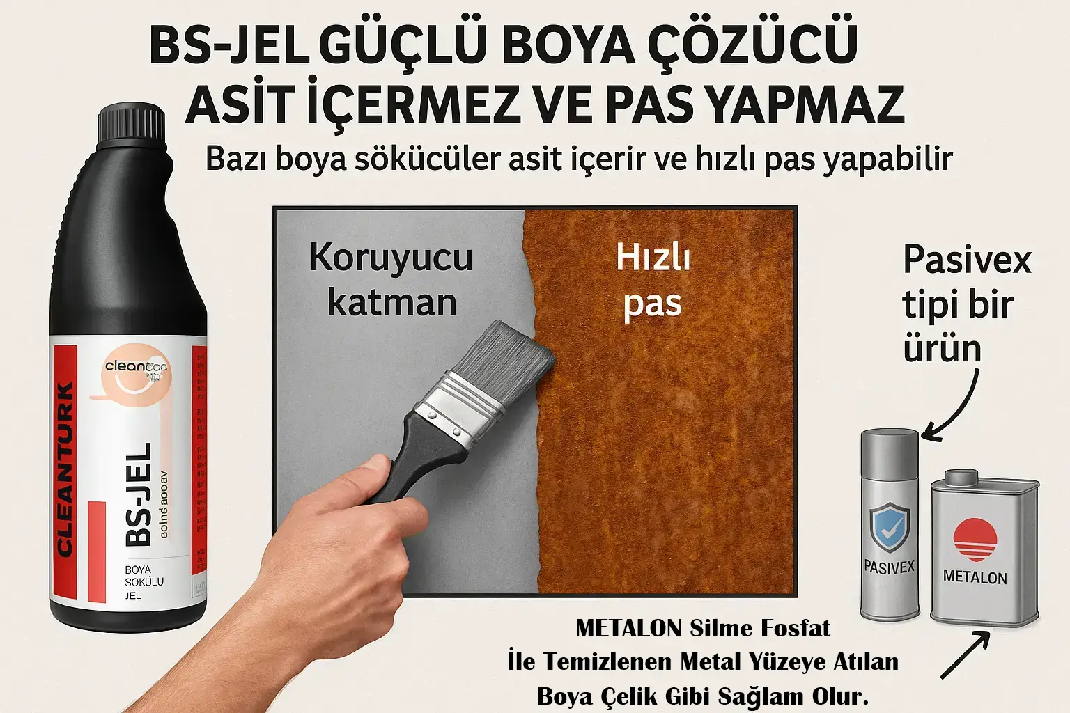 BSJEL asit içermez ve pas yapmaz; yine de pas riski olan metallerde Pasivex kullanın. Yeniden boyamada Metalon silme fosfat ile yüzeyi hazırlayın; yalnız tinerle silmek yeterli olmayabilir.
