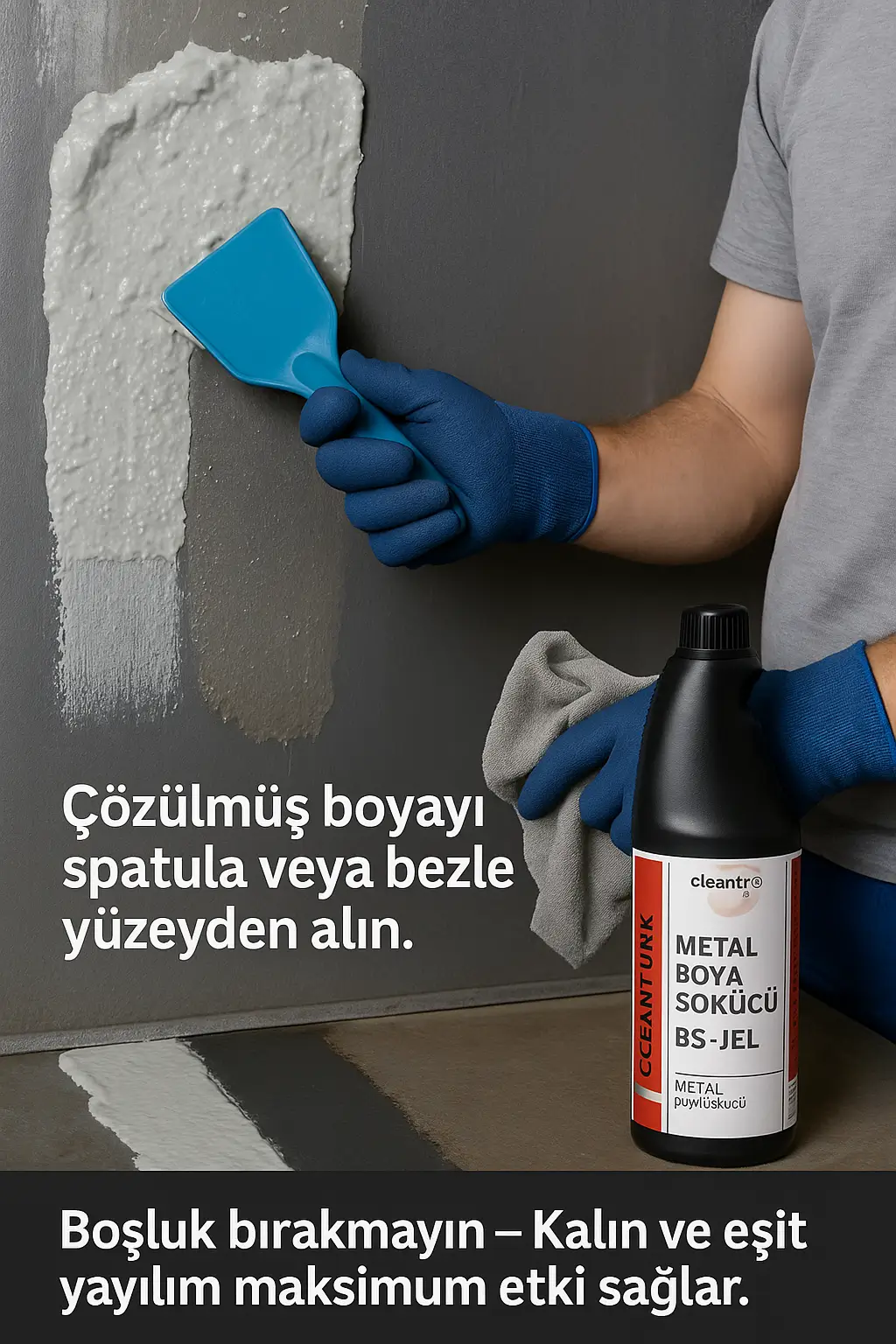 Plastik spatula ile yüzeyi çizmeden kabaran/yumuşayan boyayı sıyırın; bezle artıkları alın. Çok katlı sistemlerde gerekirse işlemi tekrarlayın.